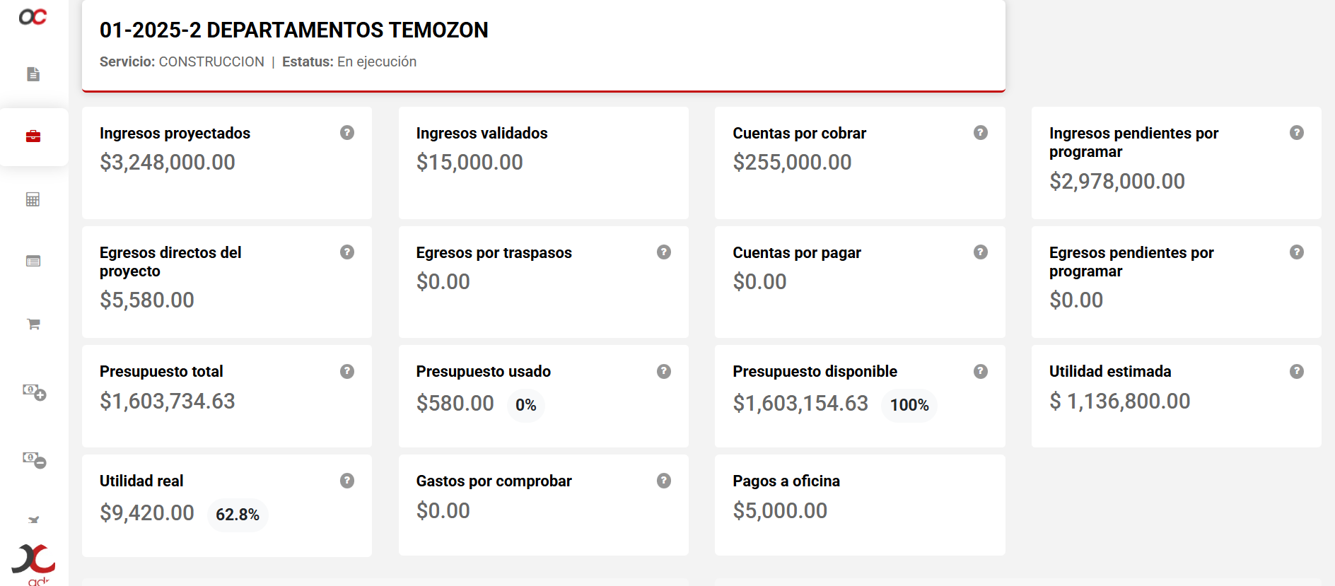 En el tablero general se podrá visualizar un resumen de toda la información administrativa del proyecto, tal como: