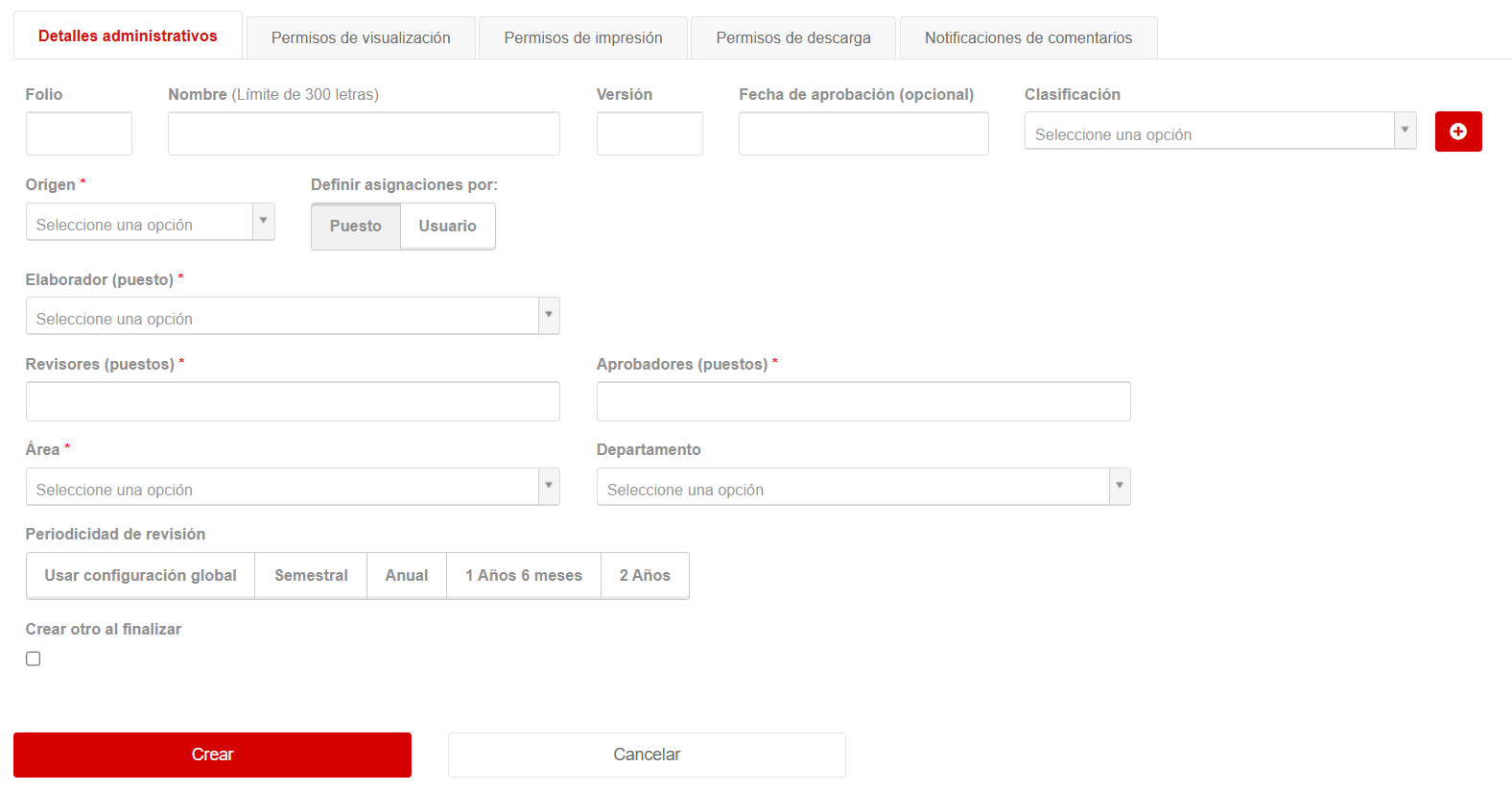 Definir asignaciones por: Puesto/Usuario. Si se selecciona la opción de asignaciones por Puesto, la tarea de Elaboración, Revisión y Elaboración de documentos aplicará para todos los Usuarios de los puestos correspondientes. Si se selecciona la opción de asignaciones por Usuario, la tarea de Elaboración, Revisión y Elaboración de documentos aplicará para los Usuarios en específico, independientemente de su puesto.
