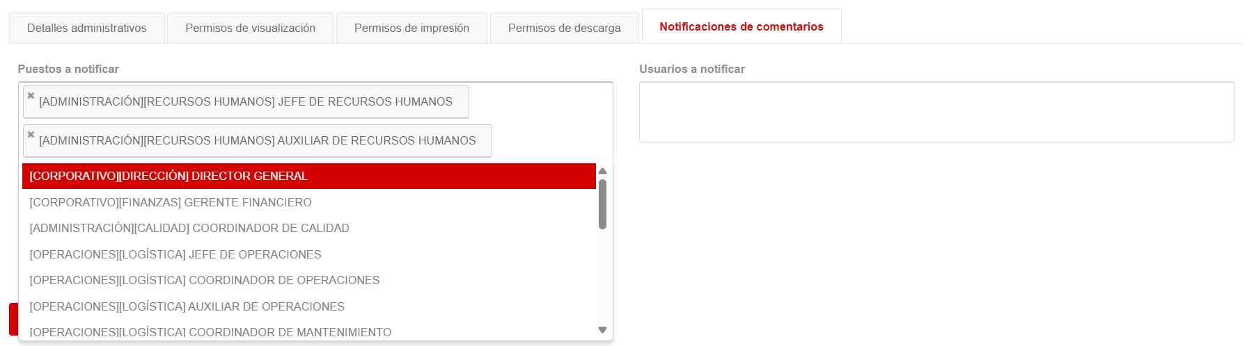 2. Hacer clic en el campo de Puestos y seleccionar los puestos que requieran permiso para recibir notificaciones de los comentarios realizados al documento.