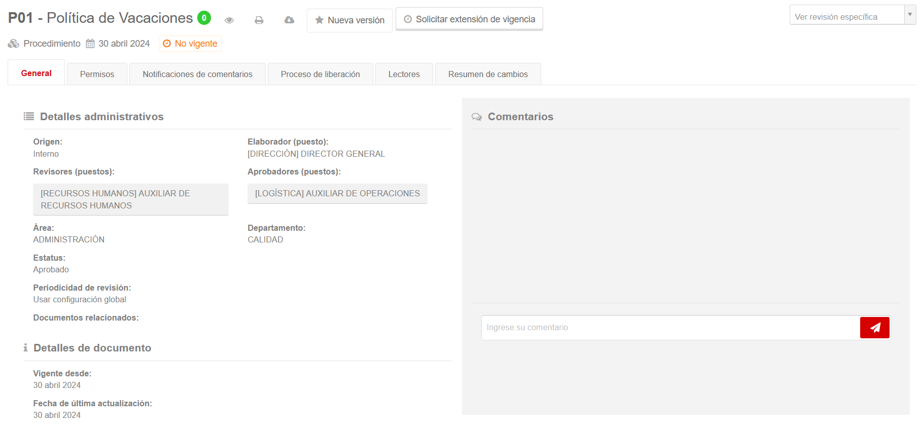 Una vez aceptado, podrá visualizar en detalles del documento que el proceso de extensión de vigencia del documento ha inciado y se ha dirigido a los Usuarios responsables de Revisar y Aprobar dicho documento, mismos que habrán recibido un correo o notificación del sistema para realizar el proceso de revisión y aprobación de la extensión de vigencia del documento respectivamente.